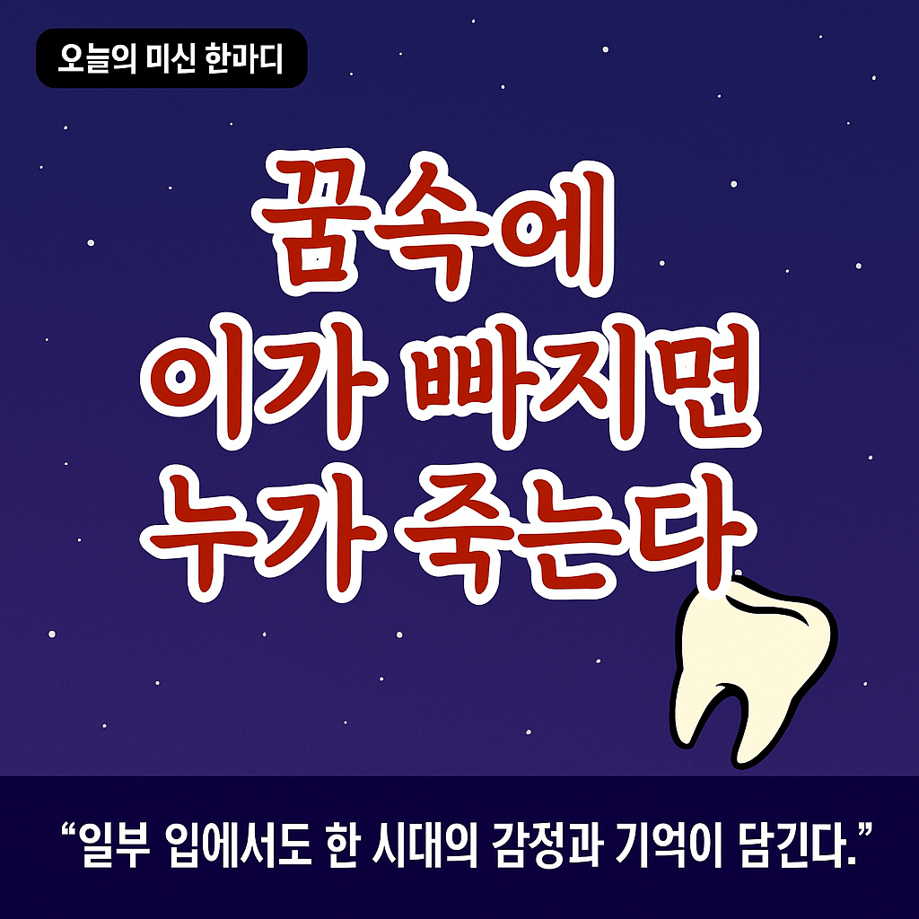 이가 빠지는 꿈은 무섭지만, 그건 누가 죽는다는 뜻이 아니라, 내가 너무 사랑하거나, 너무 지키고 싶은 무언가가 있다는 뜻일지도 모릅니다. 꿈은 죽음을 말하지 않아요. 꿈은 지금 당신 마음속에 일어나는 ‘작은 무너짐’을 알려주는 신호입니다.