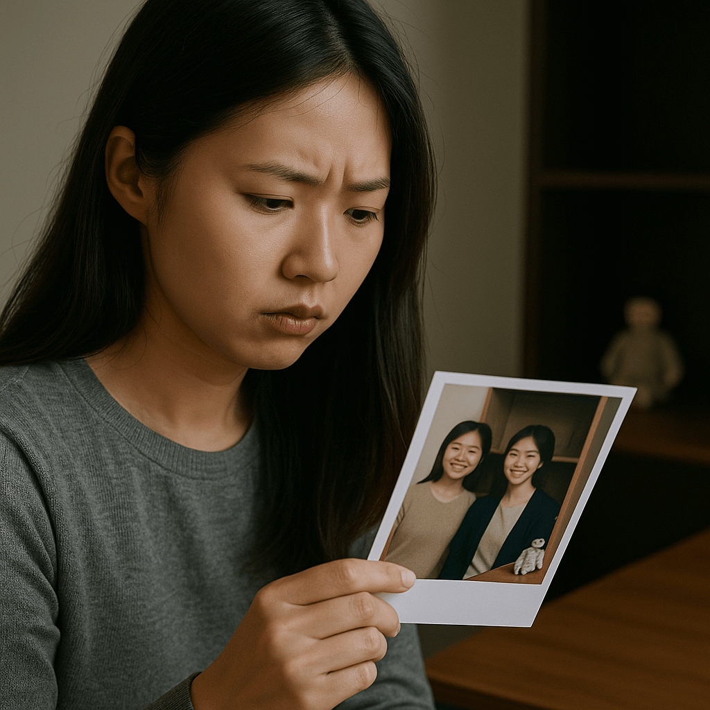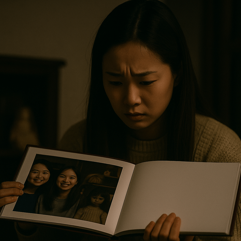 어느 날, 친구와 찍은 사진 속에서 이상한 걸 발견한 적 있나요? 모두 웃고 있는데, 뒤편 선반 위에 있던 인형 하나가 눈을 감고 있는 듯한 모습.