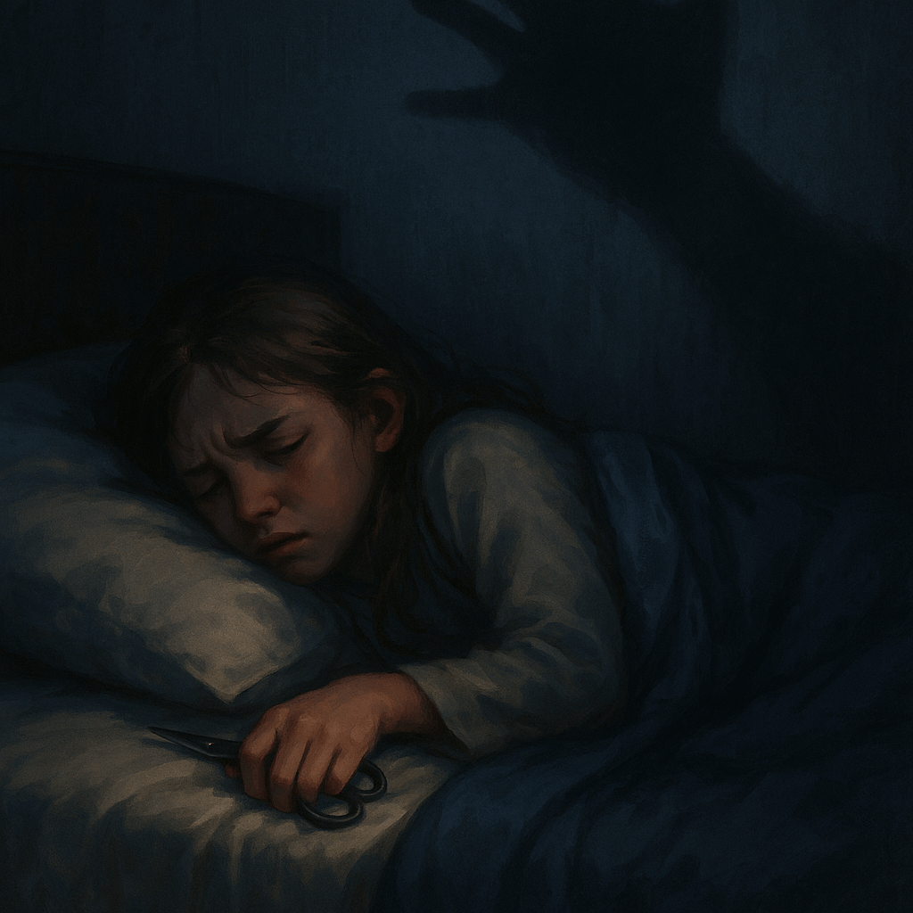 그날 밤, 소녀는 꿈속에서 같은 낯선 그림자에게 쫓기고 있었다. 거칠게 숨을 몰아쉬며 도망치던 그 순간, 어두운 공간 한가운데에서 베개 밑을 뒤적였다.