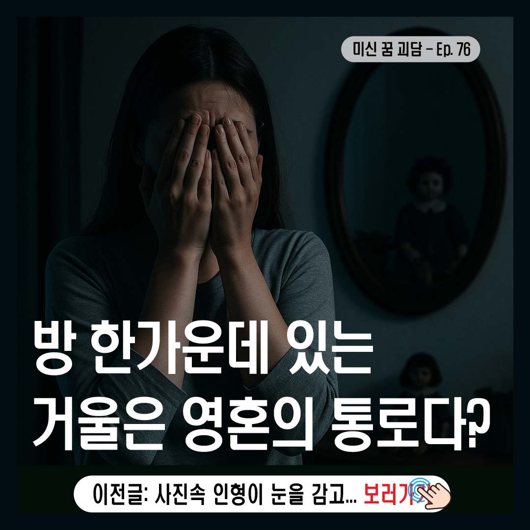 거울은 단순한 반사도구가 아니다. 방 한가운데 있는 거울은 당신의 일상 깊숙이 침투한 ‘통로’ 일 수 있다. 인형은 그 경계에서 당신을 바라보는 또 다른 존재의 눈일지도 모른다.