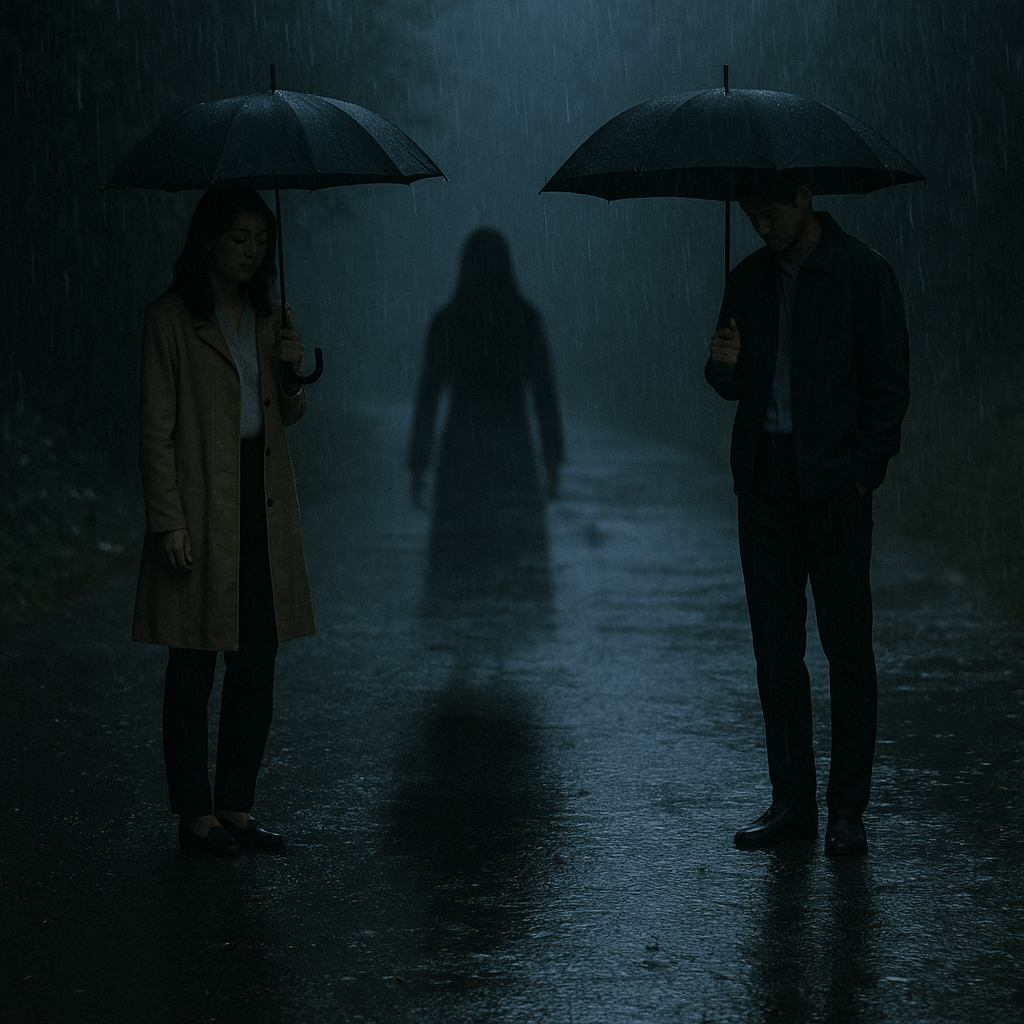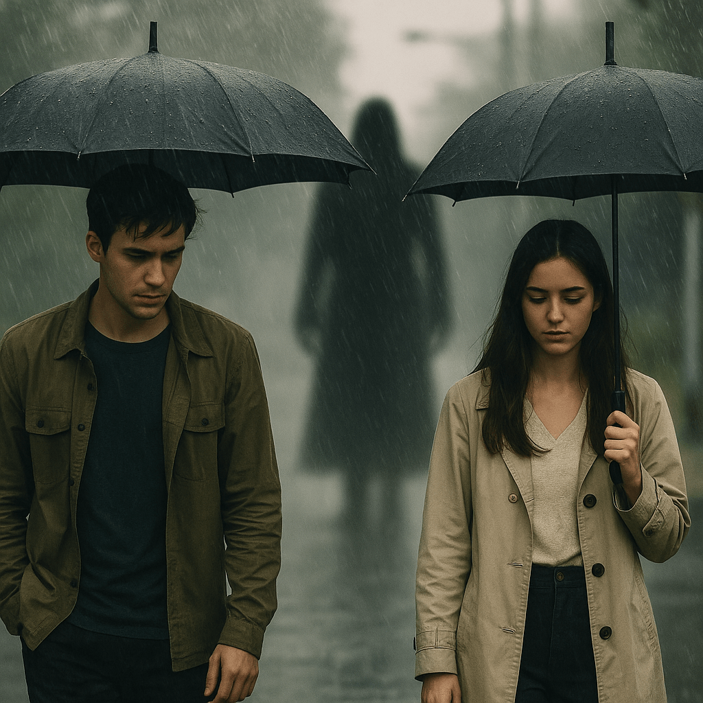 그림자는 하나로 줄어들었지만, 두 사람의 마음은 이미 오래전부터 갈라져 있었다. 잠시의 정적 속, 숨소리마저 멎은 듯한 긴장. 한 사람은 조용히 발걸음을 옮기고, 남겨진 우산 아래엔 이제 빈 그림자와 흔들리는 우산만이 남아 있었다.