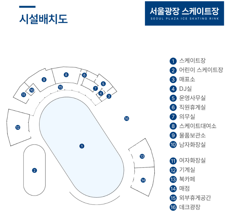 스케이트장은 어린이들이 이용 가능한 '어린이용 스케이트장'과 '일반 스케이트장' 두 가지를 갖추고 있으며, 스케이트장 외에도 스케이트 대여실, 야외 휴게소, 야외 상설무대, 물품 보관소, 남녀 화장실 등 편의시설도 마련되어 있습니다. 상설무대에서는 이벤트 행사도 진행 예정입니다.