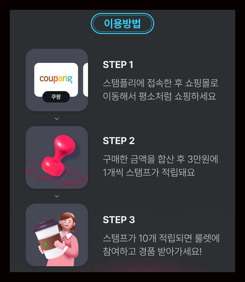 • 스탬플리는 연계되어 있는 쇼핑몰에서 일정금액 이상의 제품을 구매하고 스탬프를 모아 100% 당첨되는 룰렛을 돌릴 수 있는 리워드 서비스입니다.