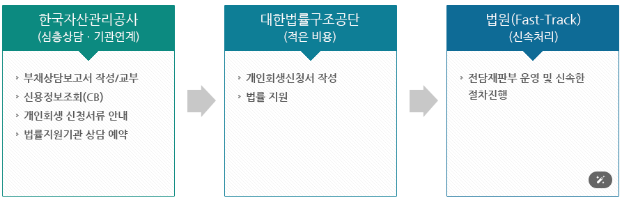 • 한국자산관리공사 채무조정 프로그램에 참가한 채무자 중 지원대상에 해당하는 채무자는 한국자산관리공사의 지원을 받아 신속하게 개인회생절차를 진행할 수 있습니다.